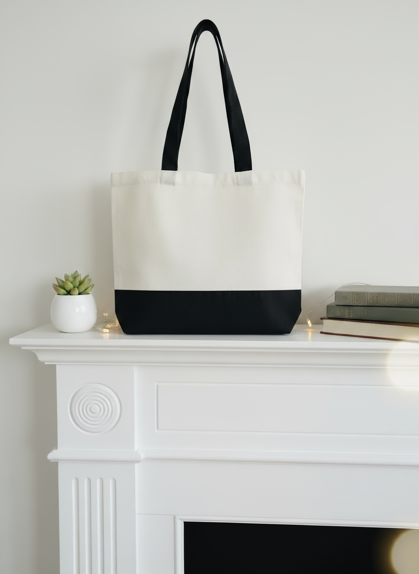 Ob beim Einkaufen, am Strand oder im Alltag: unsere weiße Canvas-Tasche mit schwarzem Boden bietet viel Platz und dazu noch deine ganz individuelle Note.